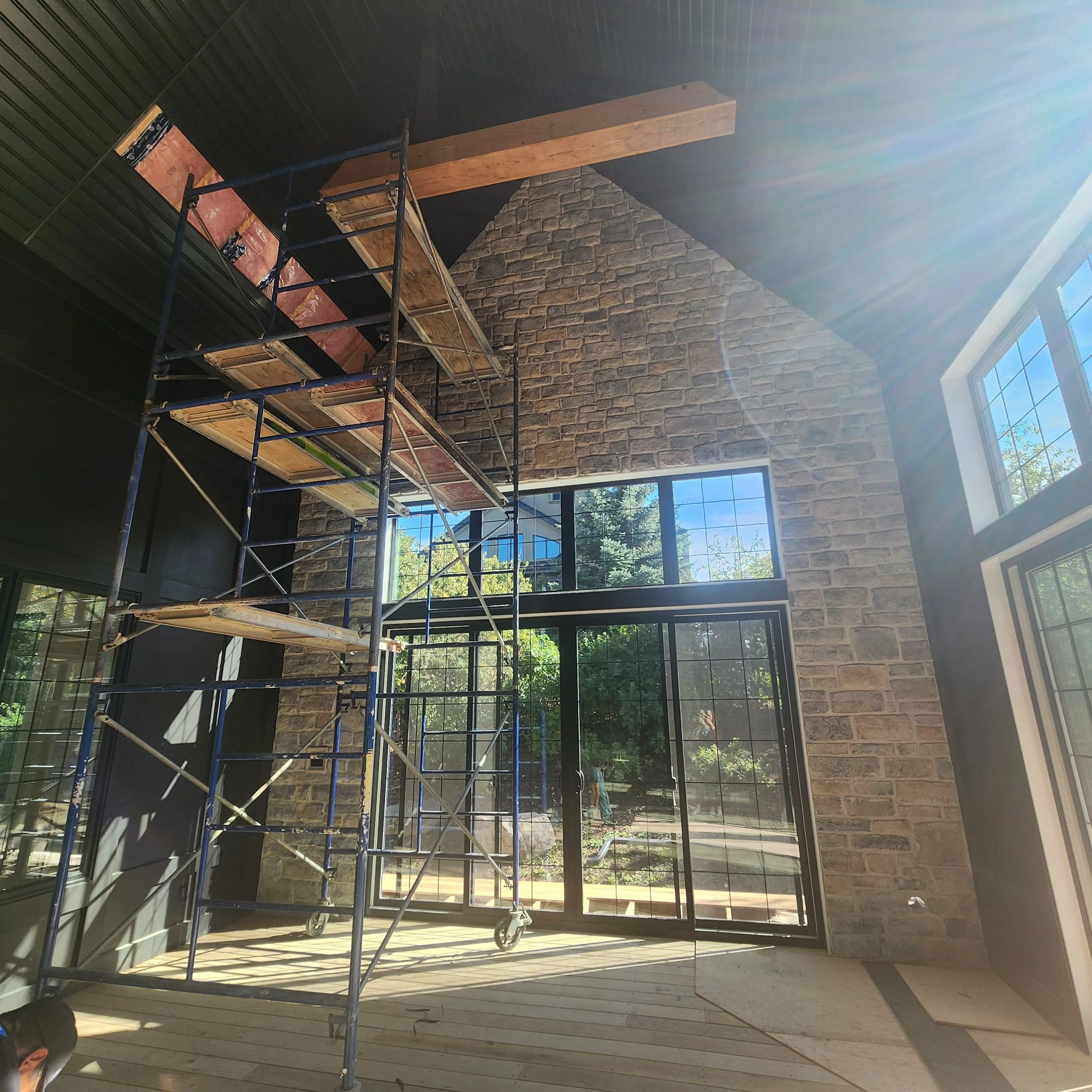 This stunning 1.5 storey design was created to take advantage of southern sun exposure and river valley views. Sweeping rooflines connect the upper loft and balcony to the entry, with extensive stone detailing and wood accents to make the open gables pop. The steep rooflines are carried into the house with grand vaulted ceilings in the great room and primary suite.